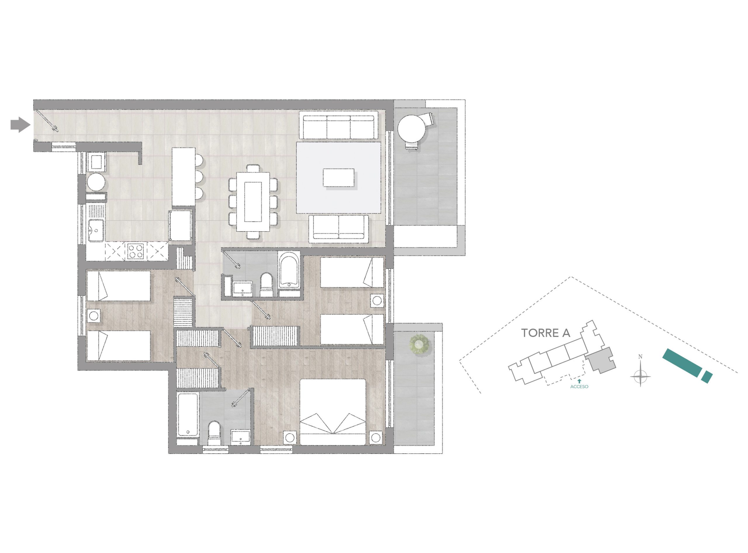 El condominio cuenta con 2 edificios de 13 pisos cada uno con departamentos de 2 y 3 dormitorios, además de 1 exclusivo penthouse de 5 dormitorios en el último piso.